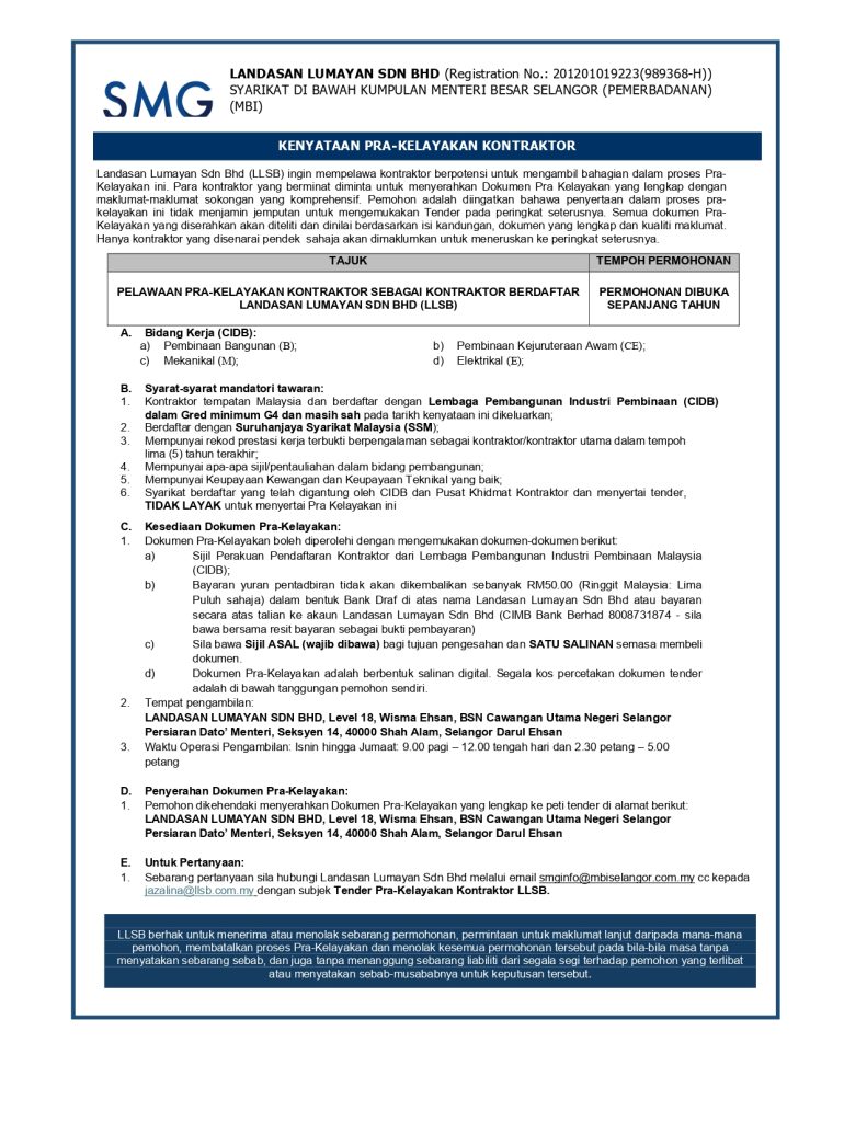 Pelawaan Pra-kelayakan Kontraktor Sebagai Kontraktor Berdaftar Landasan Lumayan Sdn Bhd (LLSB)